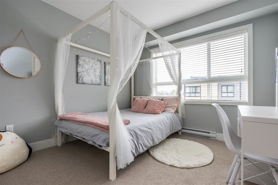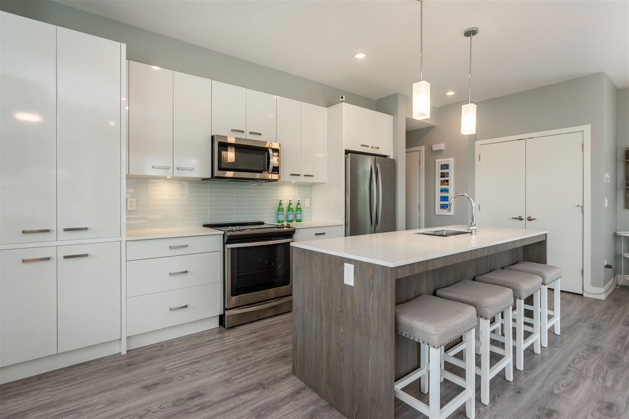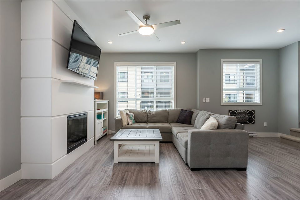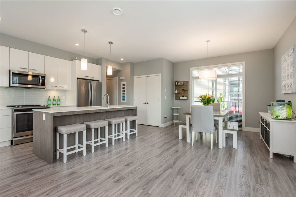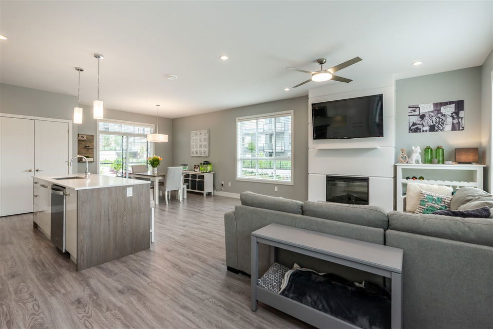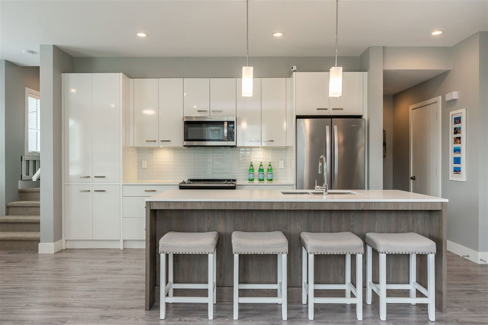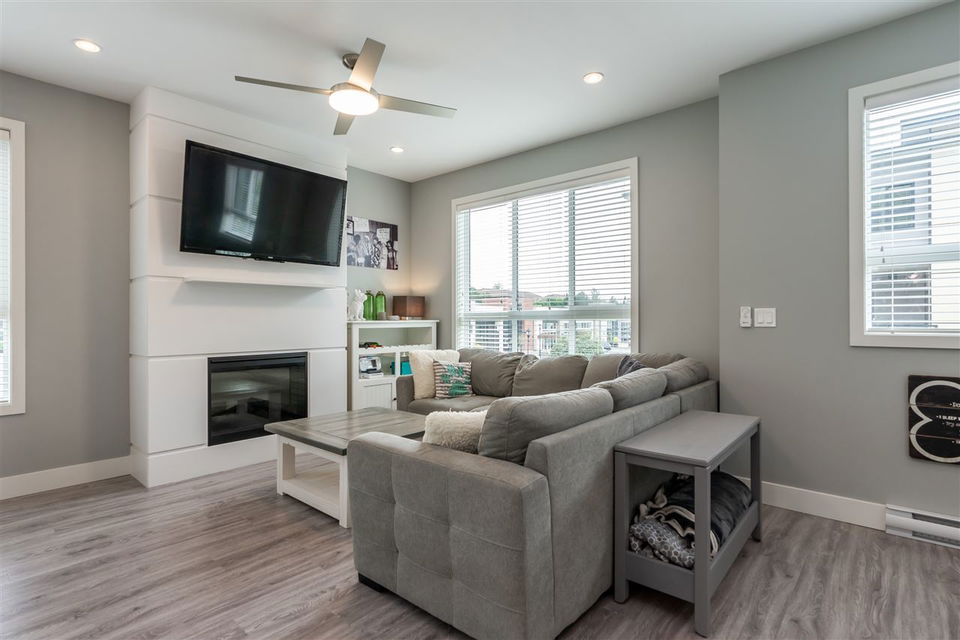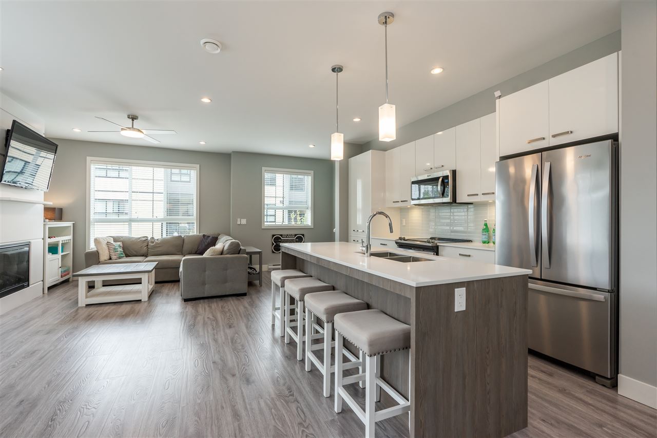 Welcome to PARALLEL SOUTH! Gorgeous, like-NEW 3bed/3bath END UNIT townhome with 4 car parking has it all: designer colours, bright, open and upgraded floorplan, loads of storage, balance of home warranty and so much more! Main floor features laminate throughout, kitchen with SS appliances, island, pantry, access to balcony off spacious dining area, cozy fireplace in the large living area and conveniently located powder room. Upstairs offers 3 large bedrooms, including master with ensuite and walk-in closet, main washroom and laundry. Below is the double car garage with tons of storage and access to covered patio and fenced in backyard, perfect for bbqs, kids and pets. Great location, walking distance to ALL the things including coffee shop, yoga, gym, plus easy access to transit and HWY 1.