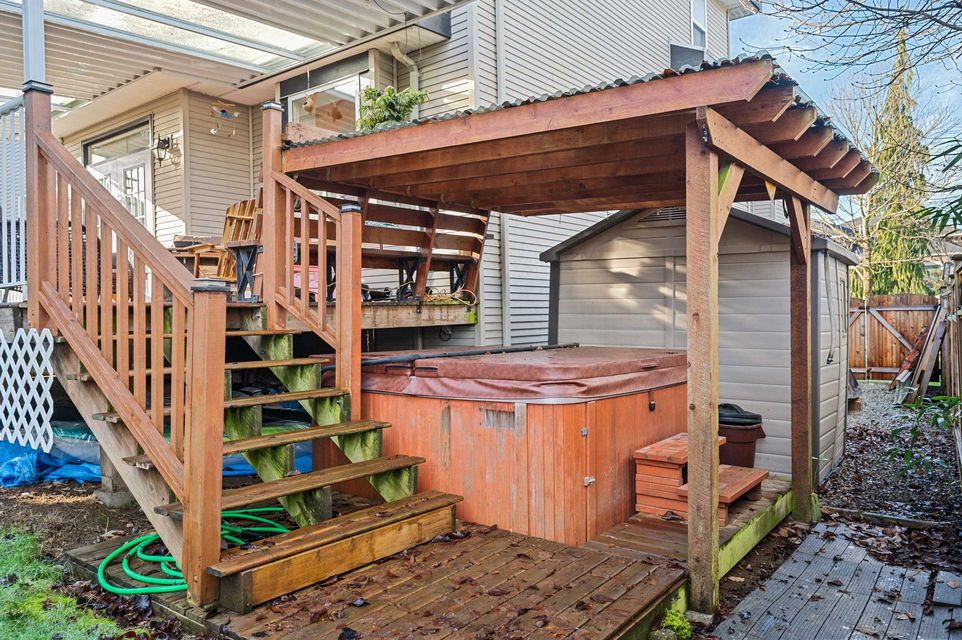 WELCOME HOME to this family home with 2 bedroom basement suite located in Fleetwood. Traditional layout with large tiled entry, separate living/dining and an open kitchen with family room and bonus DEN on main floor. Large covered deck with steps down to yard with pond, and separate steps down to the covered hot tub. Upstairs has 4 spacious bedrooms, a laundry room with side-by-side washer/dryer, and a welcoming primary suite with walk-in closet and updated bathroom. Recently painted, this home features a heat pump AC, concrete tile roof, 2-year old fence, updated counters and bathrooms, some window replaced and more. Spacious suite has it's own entrance. Call today and make this house your new home!